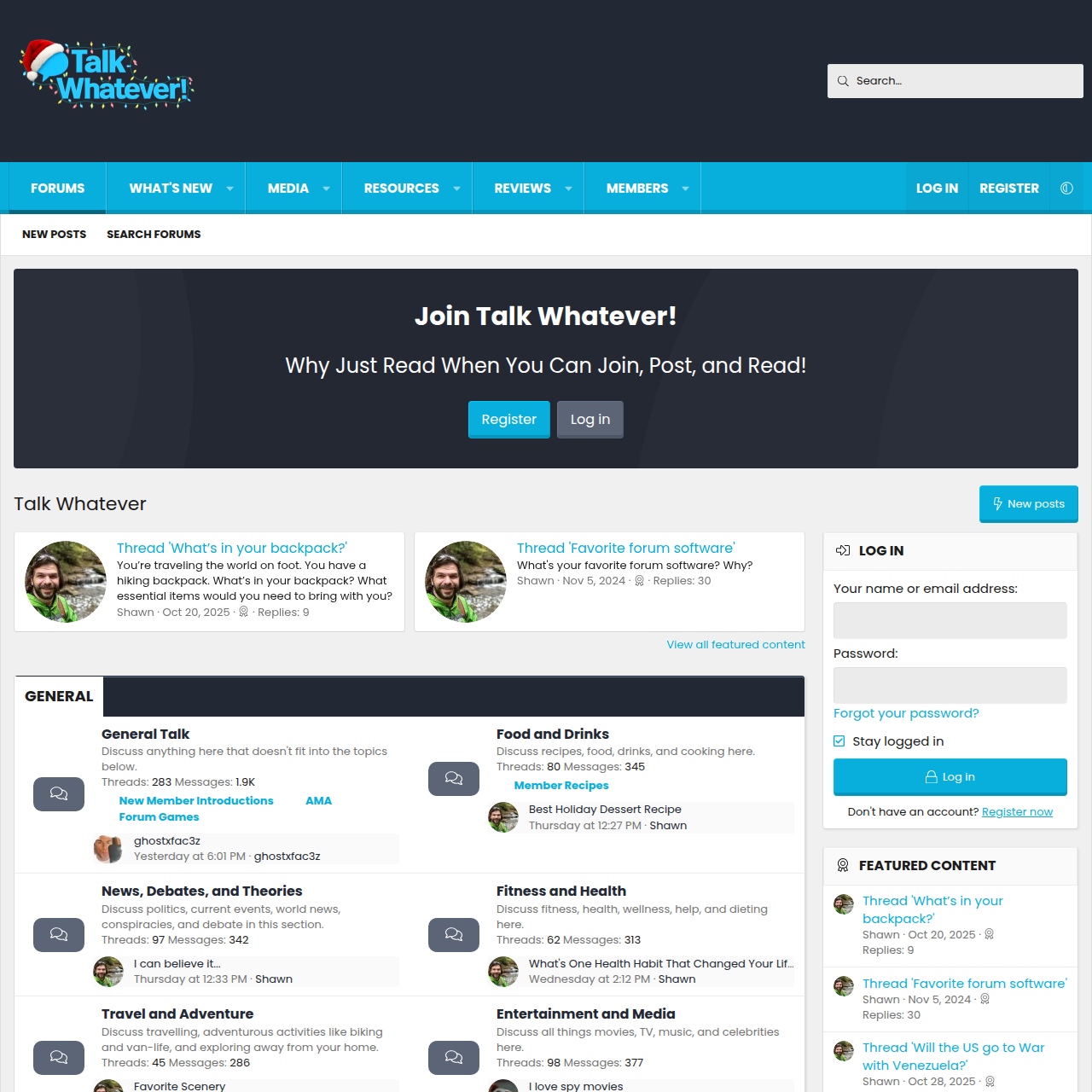 Talk Whatever is a friendly general discussion forum where you can talk about anything—from daily life and current events to fitness, food, movies, gaming, web development, and more.